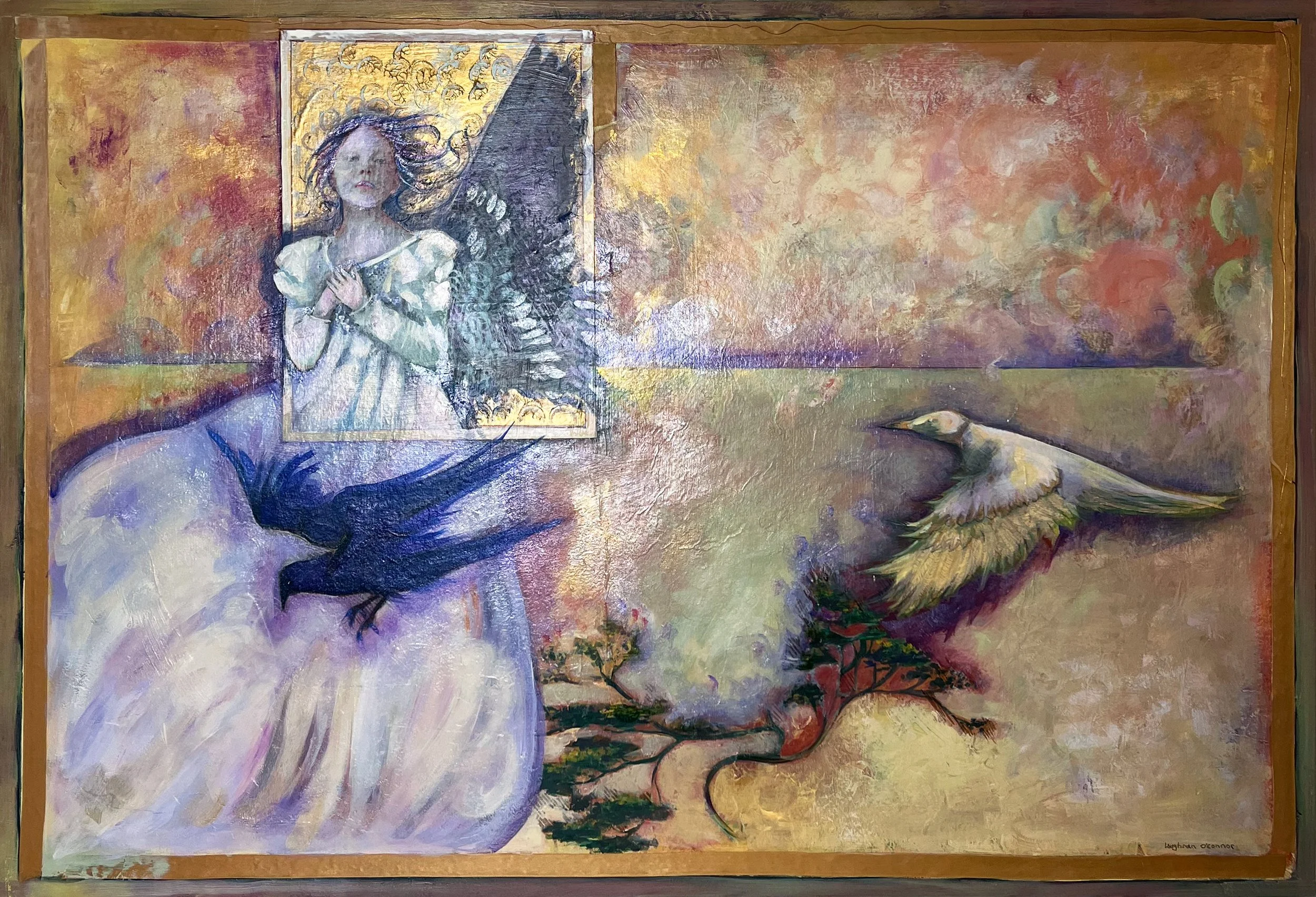This is the same painting under differently-angled lighting, to show the illuminating effects of the different mediums that were used. >>